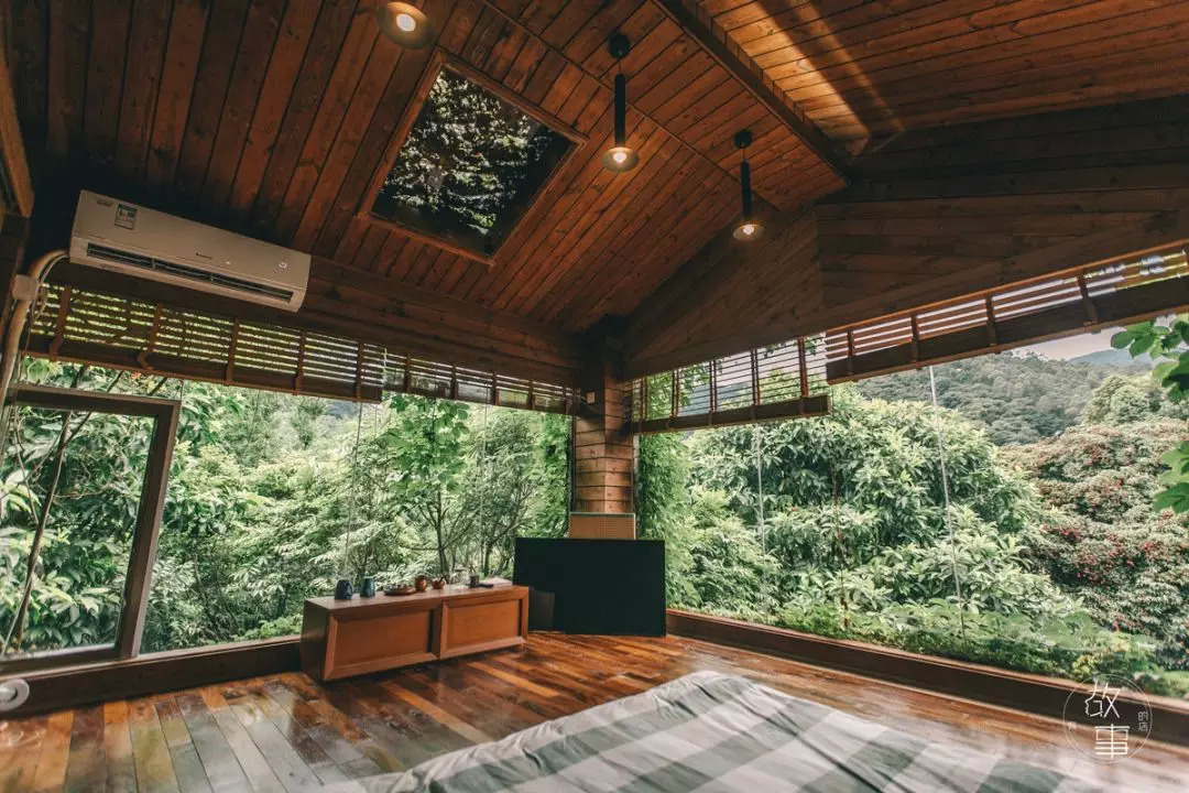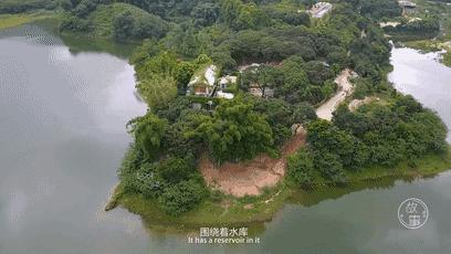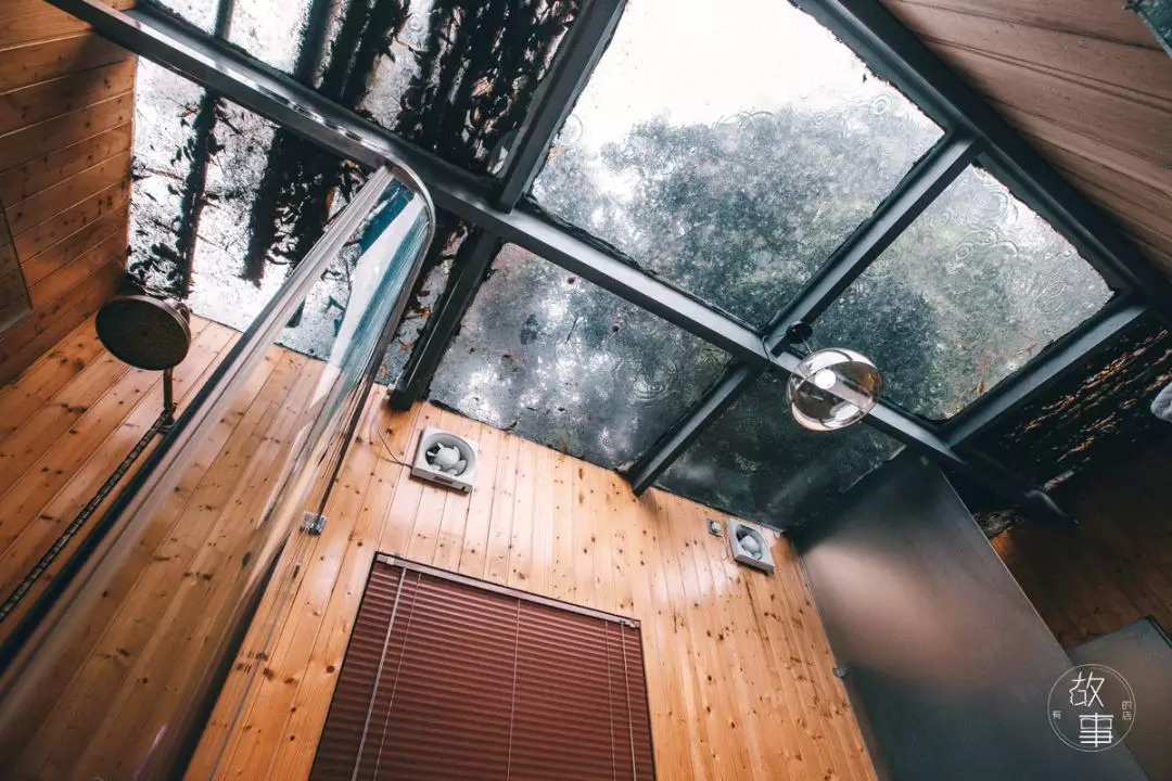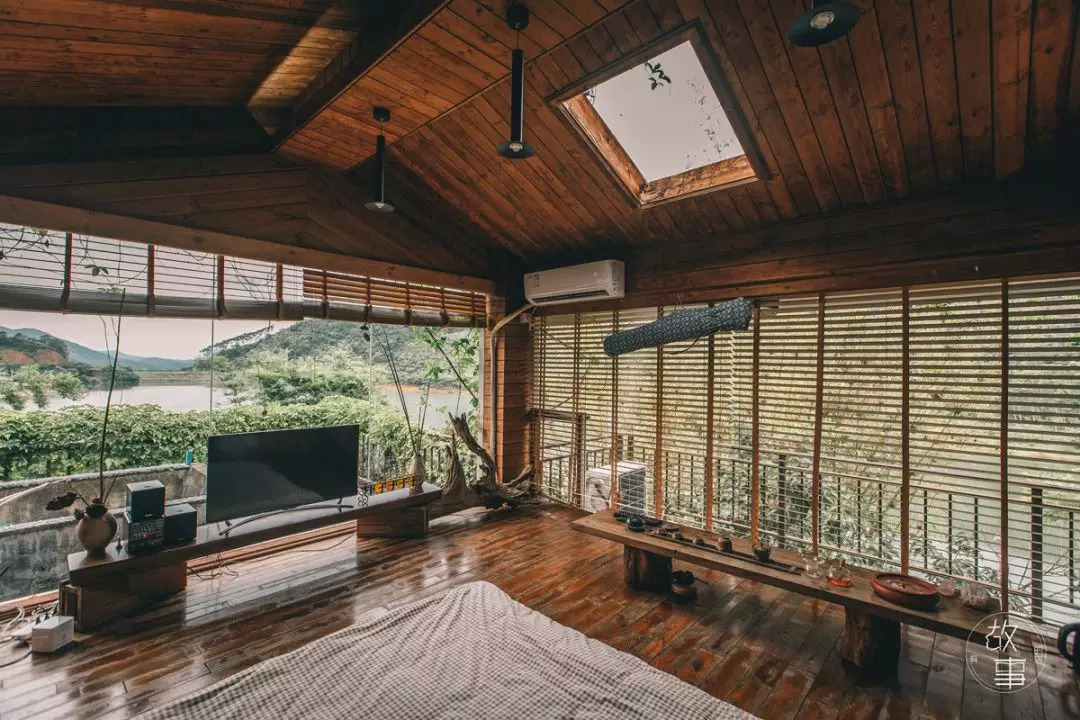 玻璃房的前方正是开阔的水库,水质清澈透亮。打开窗,便是真正的依山傍水。点点的细雨打在湖面上,微风带起的阵阵涟漪在水面上飘荡着。