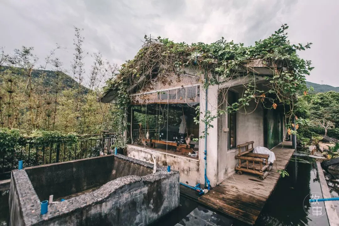 客栈位于公路对面凤凰水库的一座矮坡上,三面换水。远远望去,房子被绿色的植物盖得满满当当。如果没有指路的木牌,路过的旅人怕是很容易错过。