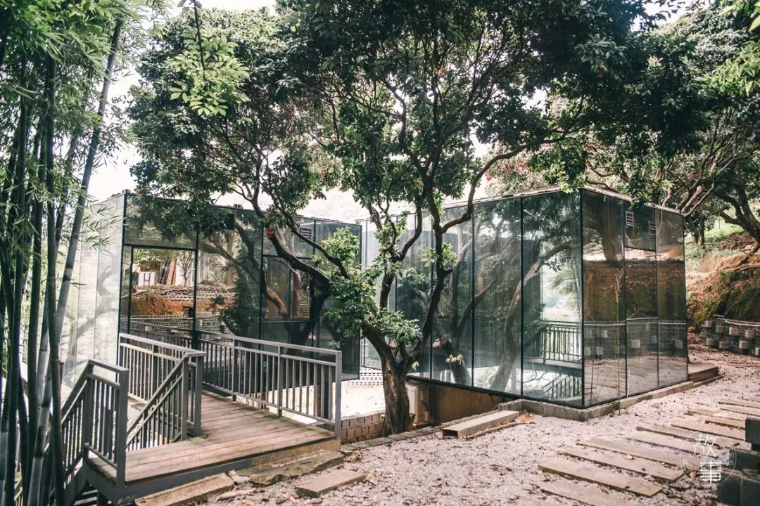临水边的3间玻璃房为陈瑜瑜新建,开业以来颇受追捧。连接民宿大厅通往玻璃房的是一条青石板的小路,路边长满了葱葱郁郁的植物,透着一丝阴凉。沿着台阶向下走,便可看到四四方方的玻璃盒子,墙面反射着远处的蓝天白云,煞是好看。