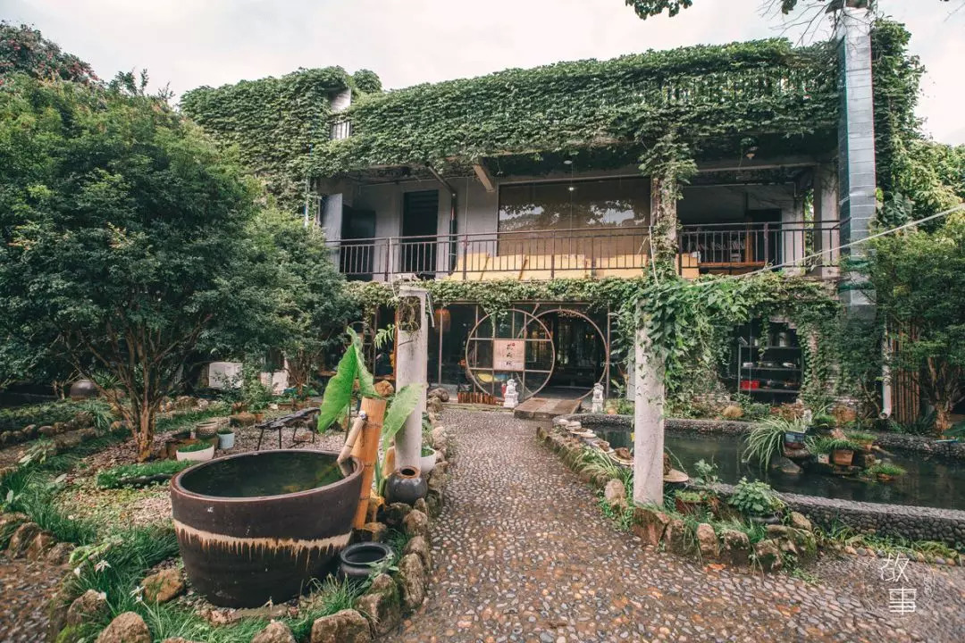 站在客栈门前的小院子里,第一眼看见的就是密密麻麻的爬山虎覆盖住整个白色墙体,绿油油一片。正门口则用石头砌了一个小型的喷水池,与旁边的大水缸呼应。与一般水池里养鲤鱼招财的做法不同,陈瑜瑜在水池里养了将近两条一臂长的草鱼,为了吃。