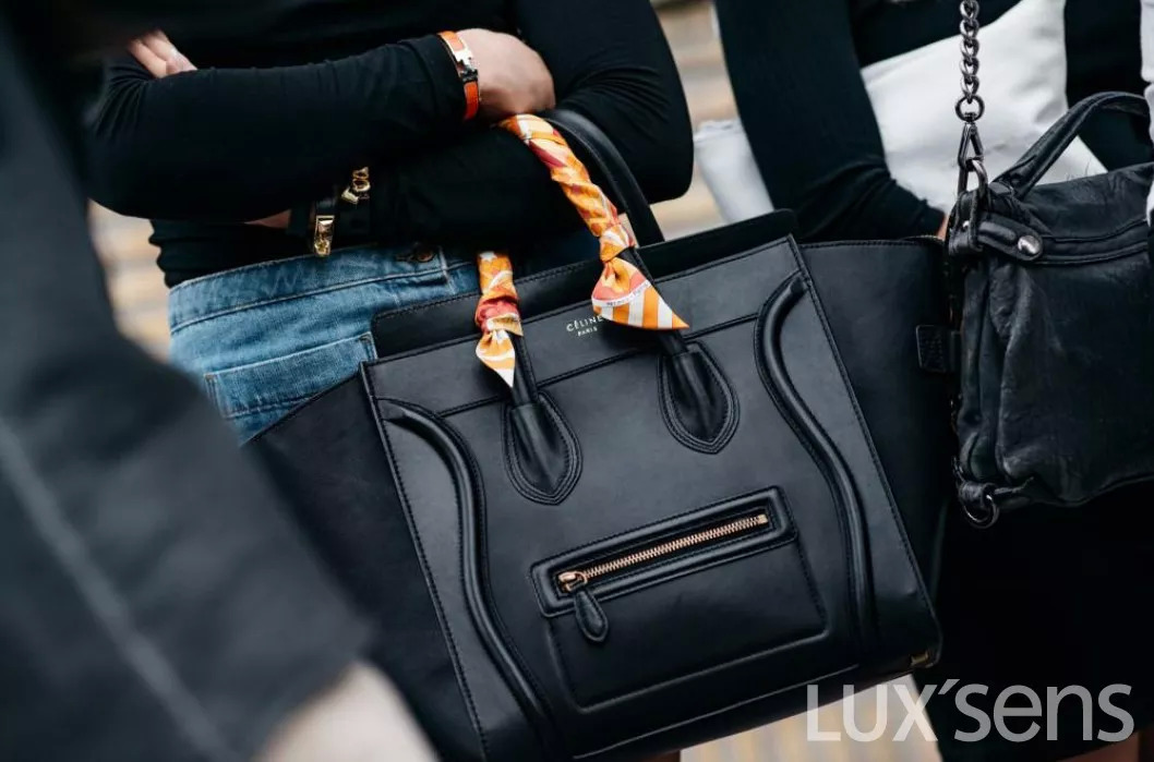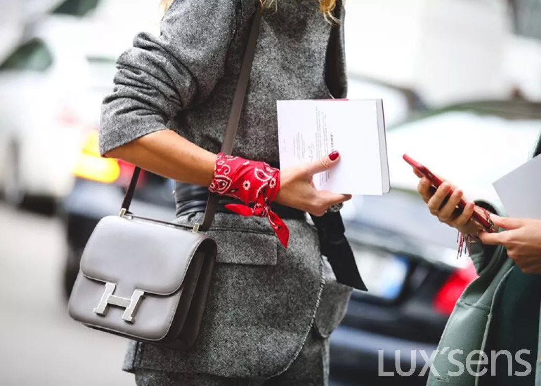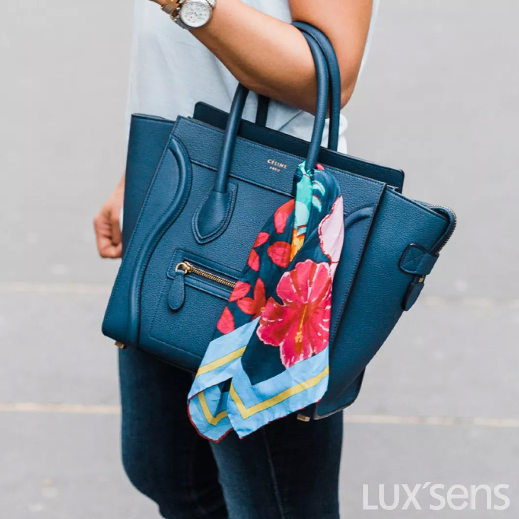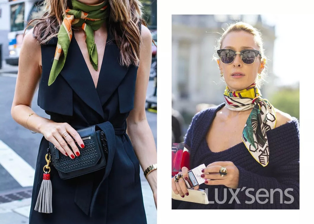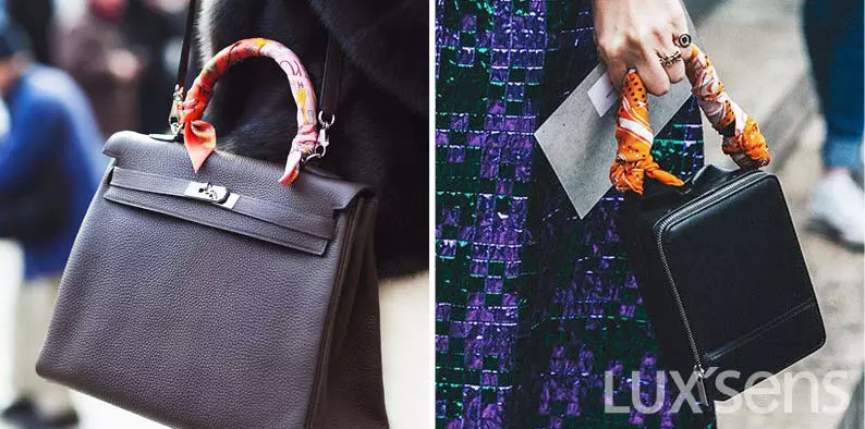 众所周知的一个用法就是用来当作包包手柄处装饰用,比如在黑色款的包包上搭配一条亮色系的丝巾,可以说是点睛之笔了。