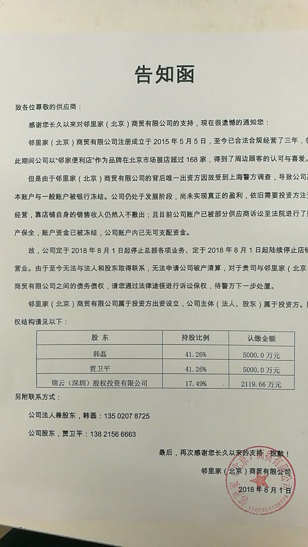 8月2号凌晨,一份被曝光的“告知函”显示,邻里家(北京)商贸有限公司向供应商发出通知,公司背后唯一的出资方因故受到上海警方调查,导致公司银行账户被冻结,公司账户内已无可支配资金。由于无法与公司法人及股东取得联系,供应商与邻家便利的债权债务,只能通过法律途径进行诉讼保全,等待警方下一步处置。