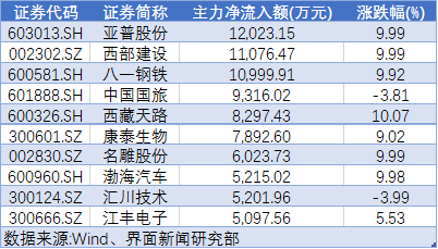 剔除尚未开板的新股,全天,主力资金净流入额超过1亿元的个股仅有2只。次新股亚普股份(603013.SH)封涨停,主力资金净流入1.20亿元。西部基建股掀起涨停潮,西部建设(002302.SZ)、八一钢铁(600581.SH)、西藏天路(600326.SH)等个股分别获主力资金净流入1.11亿元、1.10亿元、0.83亿元。值得注意的是,疫苗股康泰生物股价大涨9.02%,主力资金净流入0.79亿元。