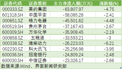 全天,沪深两市共计35只个股主力资金净流出额超过1亿元。美的集团(000333.SZ)、格力电器(000651.SZ)分别遭遇主力净流出6.38亿元、4.55亿元,其中格力电器已连续7个交易日遭主力抛售。贵州茅台(600519.SH)、五粮液(000858.SZ)双双下挫,其主力资金净流出额分别为3.72亿元、3.36亿元。