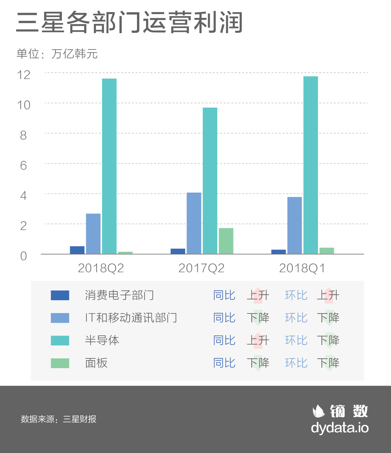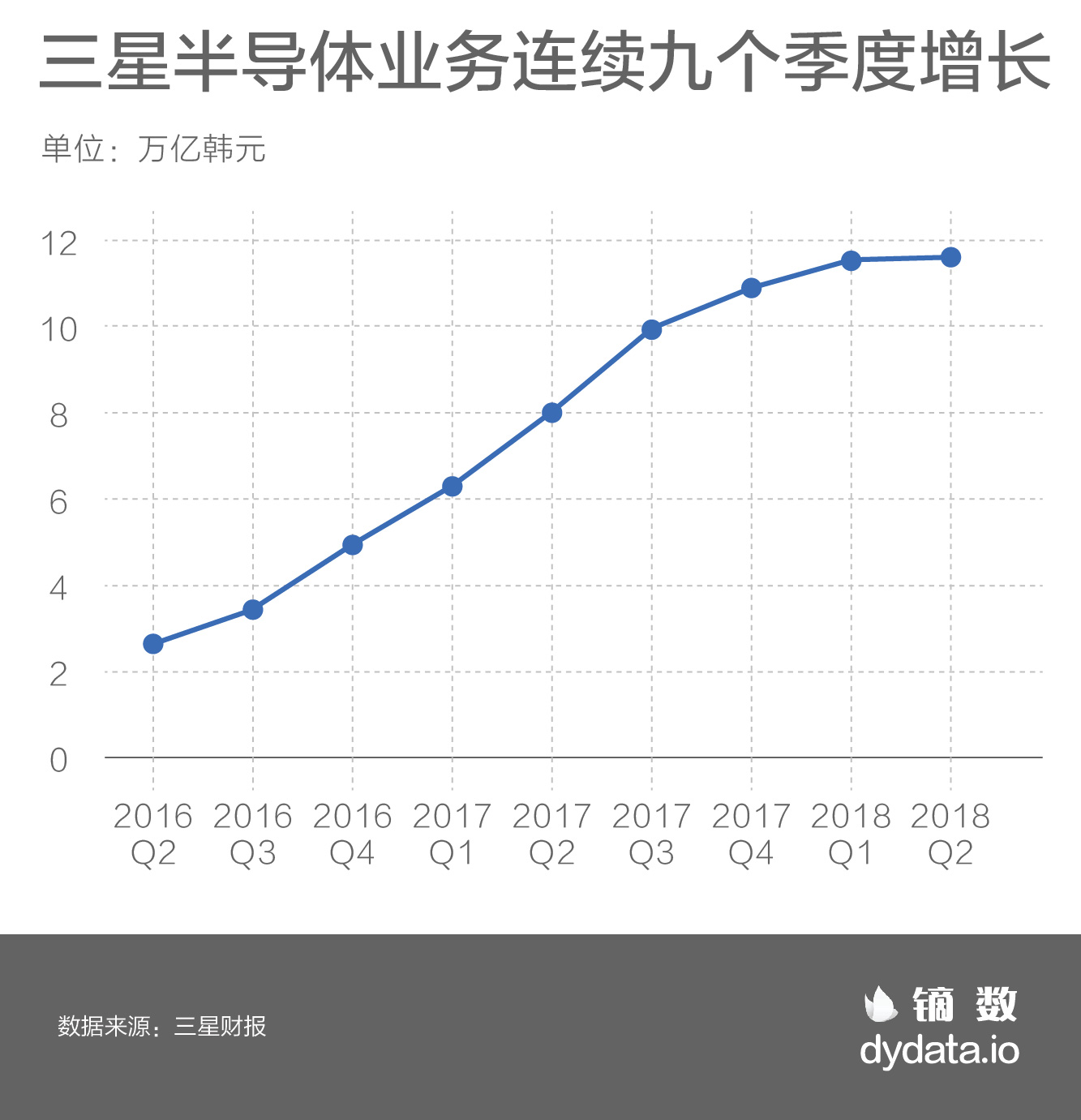 首先,半导体已然成为了成为业绩支撑的主力部门。镝数整理的历史据显示半导体业务可以说是近年来三星电子利润增长的关键:在2016年第二季度半导体业务运营利润仅为2.64万亿韩元,经历了连续9个季度稳步增长,2018年第二季度已经达到11.61亿万韩元。