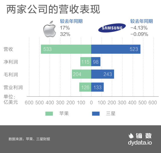而三星电子最新财报显示,当季度营收为58.48万亿韩元(约合523亿美元),同比下滑4.13%;净利润为11.04万亿韩元(约合98亿美元),同比下滑0.09%。虽然与去年同期相比,三星没有得到一个很好的成绩,但是横向来看,与苹果的数据基本处于同一水平。