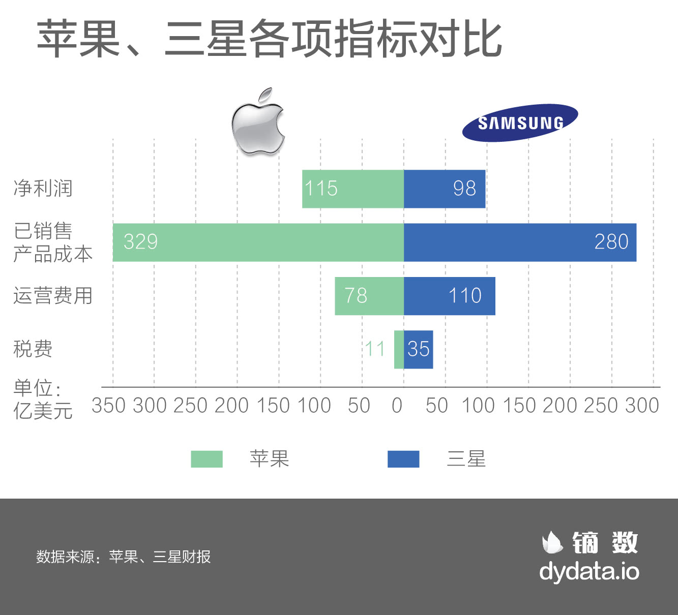通过图表我们可以发现苹果在产品的成本上的总开支要高出三星不少,但是得益于低廉的运营费用和税费,使得苹果最后在数据表现上优于三星。这两点恰恰是可以体现一个国家商业环境的标准。我们或许可以通过这两家公司的数据推断出,美国的经商环境要比韩国或优越不少。