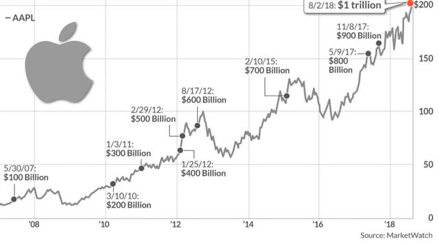 几乎没有任何意外,苹果成为了首个市值超过1万亿美元的美国上市公司。