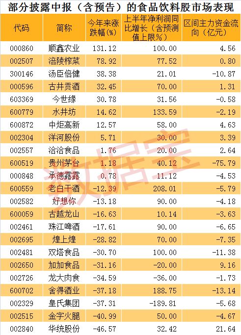 此外,从当前披露中报或预披露中报的数据来看(预披露的数据取增长上限),上涨股净利润均同比正增长,顺鑫农业、涪陵榨菜、中炬高新净利润同比增幅更是超过50%。下跌股中,加加食品、龙大肉食及皇氏集团上半年净利润同比下跌20%、36%及189.81%。