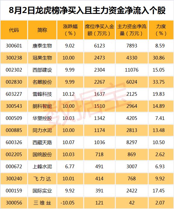 8月2日龙虎榜中机构及营业部席位资金净买入1.13亿元,其中净买入的个股有22只;净卖出的个股有20只。净买入前三名个股分别是康泰生物、冠昊生物、西部建设等,净买入金额占当日成交额比例达6.66%、17.63%、3.13%。