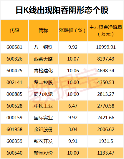 最新数据显示,两市共有32只个股日K线出现阳吞阴形态,当天涨幅最大的是西藏天路、青松建化、同力水泥,涨幅分别为10.07%、10.06%、10.00%。