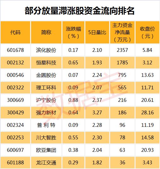 值得注意的是,21只放量滞涨股中,滨化股份、恒星科技、金圆股份、理工环科、沪宁股份等个股主力资金净流入较多。