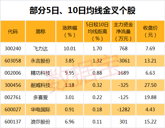 两市共有7只A股的5日均线主动上穿10日均线,其中飞力达、永吉股份、精功科技等个股的5日均线较10日均线距离最大,分别达1.70%、1.32%、0.88%。