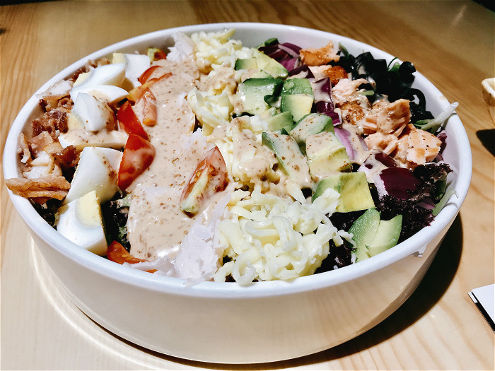 吃过主食,在这家餐厅不能错过的还有一份明星餐——招牌主厨沙拉。这份用牛油果、金枪鱼、圣女果、鸡蛋、洋葱和芝士搭配出的食物造型沙拉,奶酪虽然是点缀,但一点也不逊色,即营养又美味。