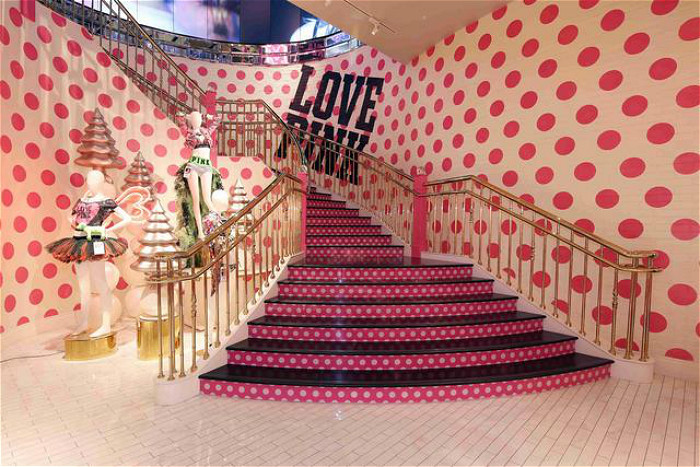 顺着背景墙前的楼梯下去,会瞬间被少女粉“Victoria’s Secret PINK”的内衣、居家及美妆产品包围着,粉红色的波点像是误入了草间弥生的世界。