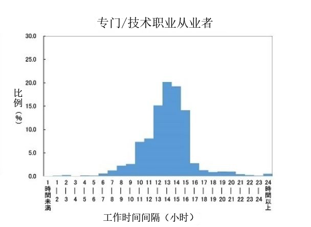技术人员和销售员集中分布在工作时间间隔较短的区域。尤其是被称作拼命三郎的技术人员,不足11小时的比例,远远高于其他所有职业,达到14.8%。这群人习惯了长时间加班并且广泛流传着“996”的传说。