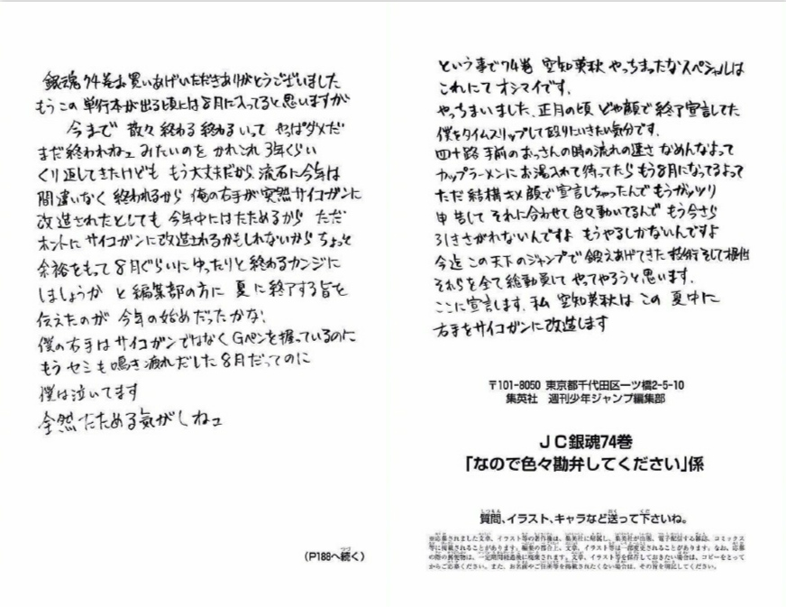 8月3日,日本漫画《银魂》作者空知英秋在单行本74卷附录留言中宣布漫画将于今年内完结:“这三年一直反复完结,没做到,完结,没做到……现在好了,今年一定会完结,就算我的右手突然被精神力炮改造了也一定完结。”
