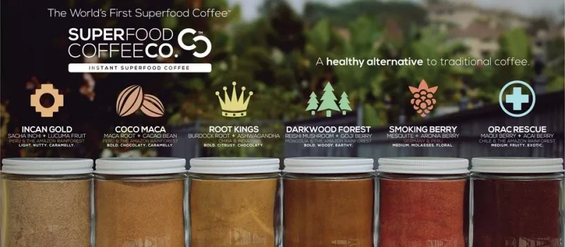 咖啡方面选用经过认证的(公平贸易)咖啡,而超级食物组合则包括:野生白桦茸、有机认证的生可可粉、玛卡根、肉桂、姜黄、蛋黄果等。