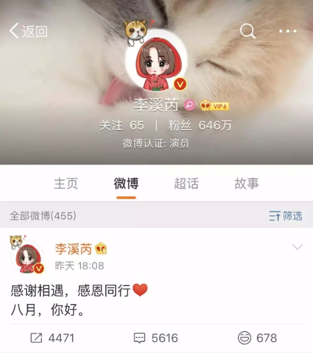 7月31日,李溪芮将微博认证从“嘉行传媒签约演员”改为“演员”。 8月1日,李溪芮微博发声:“感谢相遇,感恩同行”,似在回应解约一事。