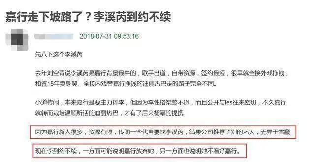 也有网友认为是杨幂方面已放弃李溪芮,虽然她在嘉行传媒属于背景最牛且自带资源出道的艺人,但因为李溪芮自身性格与公司有些关系不合,比如李溪芮曾经曝光了迪丽热巴用嗲声嗲气的声音去调戏外卖小哥,让迪丽热巴的人设崩塌,在访谈中,李溪芮曾开玩笑曝料说热巴是个“心机”女,让迪丽热巴的公关有些仓促。