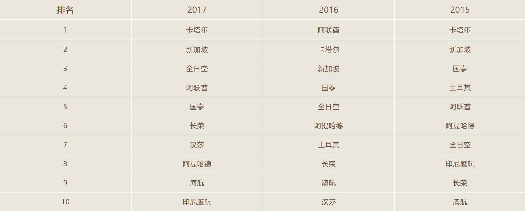 从2001年以来,国泰航空拿过四次第一名,这个记录别的公司没得比,可惜今年排名第6,排名每年退后啊!(国泰你是肿么了?不要被「因航」的名字影响好吗?)
