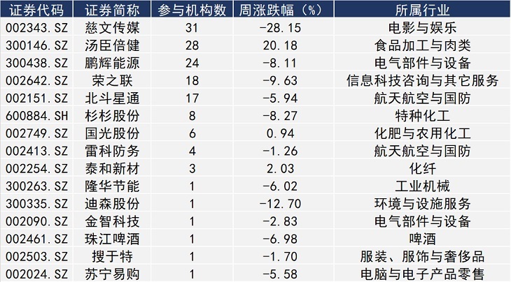 事实上,从被机构关注的受调研企业本周股价表现,也可反映出当下行情的颓势。在15家获调研的企业中,仅3家上市公司本周股价逆势。这其中,汤臣倍健(300146.SZ)逆势大涨,周涨跌高达20.18%。过去半年,该公司停牌收购澳企LSG公司获得了资本市场的认可,使得该公司复牌后未收补跌因素影响,反而股价持续上升,创下近些年来的新高。此外,国光股份(002749.SZ)、泰和新材(002254.SZ)本周股价也整体上涨,周涨幅分别为0.94%、2.03%。