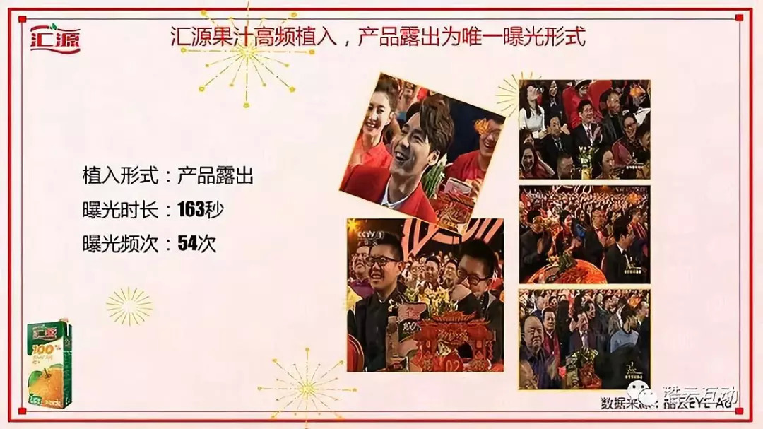 2018年春晚,曝光时长最长的是淘宝,然后新浪微博,第三名,是作为“2018CCTV春晚指定饮品”的汇源。