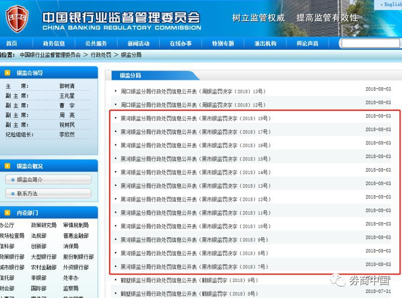 券商中国记者统计发现,过去的三天,各地银监分局的罚单几乎被黑龙江银监分局包揽,该分局连发12张罚单,其余2张由周口银监分局开出,这14张罚单均在8月3日公布。