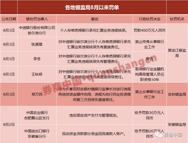 8月3日,中信银行哈尔滨分行因“个人存单质押银行承兑汇票业务违规核保”,被黑龙江银监局罚款400万元。该行4名相关责任人分别处以“禁止终身从事银行业工作”、“取消银行业金融机构高级管理人员任职资格10年”、“警告”等不等的处罚。