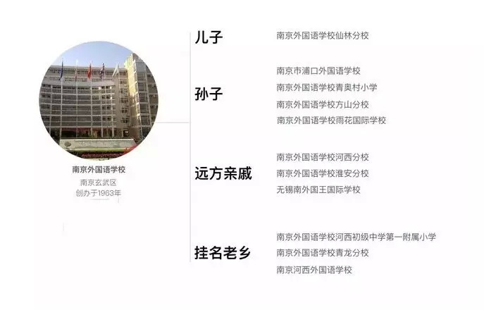 南外系分校纷纷抢驻南京各大板块,目前已经进驻的板块有仙林、燕子矶、高新、河西、城南、方山等。诸多南外分校看得人眼花缭乱,送上一张“南外亲情”关系图,供大家分辨。