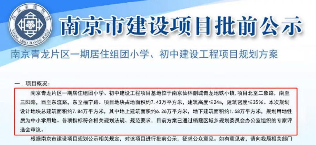 南京市规划局已公布了南京青龙片区一期居住组团小学、初中建设工程项目规划方案批前公示。