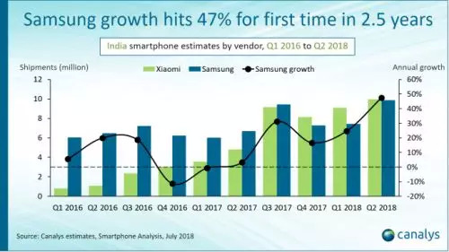 Canalys的数据则显示,2018年第二季度,三星和小米在印度的智能手机出货量均为990万部,共占印度智能手机市场60%的份额(三星为30.2%,略低于小米的30.4%),这与去年的43%相比有所上升。
