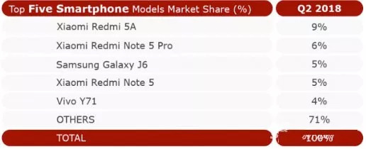 根据Counterpoint提供的数据,2018年第二季度在印度最畅销的五款智能手机占据了29%的市场份额,它们分别是红米5A、红米Note 5 Pro、三星Galaxy J6、红米Note 5以及vivo Y71。可以看到在排名前五的机型中,小米手机占据了三款,其中红米5A是本季度最畅销的机型,而红米Note 5 Pro因其性价比依然需求强劲。