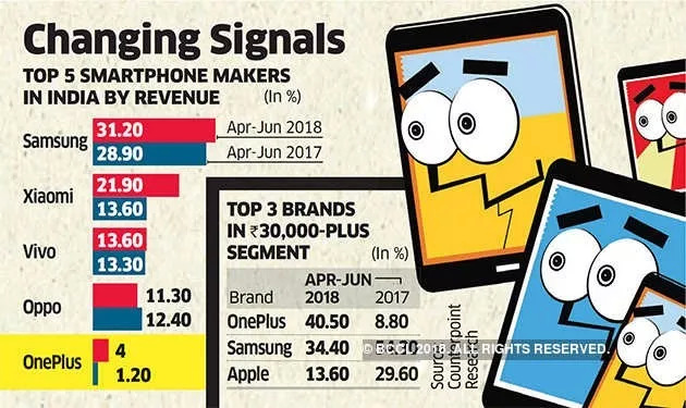其中一加更在印度3万卢比(约合400美金以上)以上价格区间豪夺40%的市场份额(一加6占比30%,一加 5T占比10%),首次在高端智能手机市场领跑。