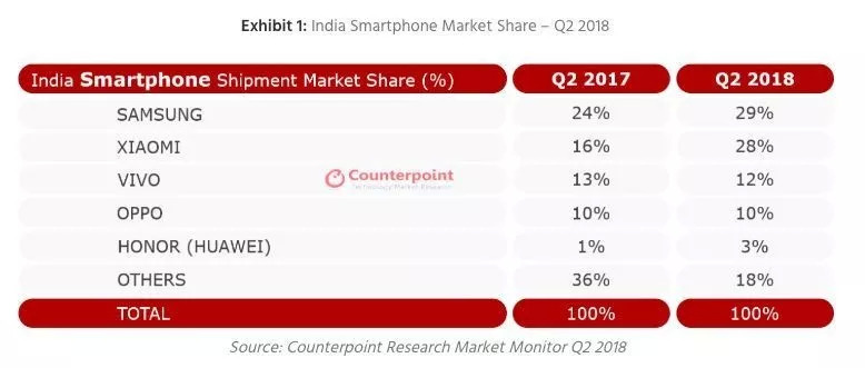 在2018年第二季度,小米的出货量创下了它在印度市场的最高纪录。