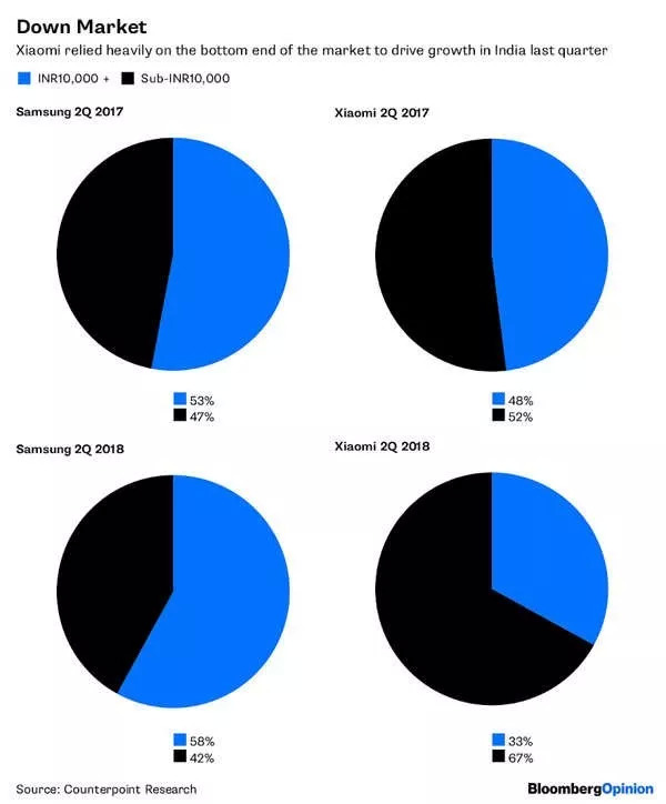 小米超过三分之二的出货量,归属于1万卢比(150美元)以下的价格区间。相比而言,三星只有42%的设备在这个价格范围内,但它却夺回了第一名。