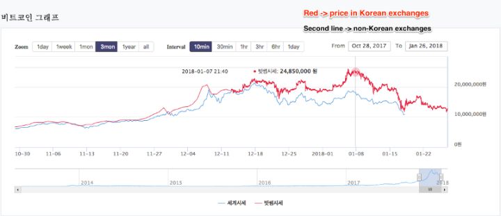 泡菜溢价在 2017 年底达到高峰,韩国和其他国家的币价差异突然飙升至 30%,最终在 2018 年 1 月 8 日创下历史新高达到 50%以上。