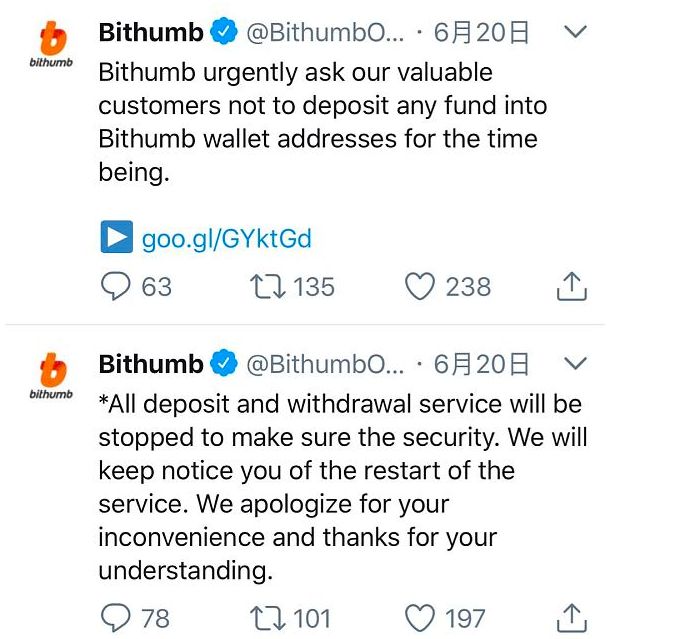 之前一直封闭的 Bithumb 也并没有和国际一线交易所同水平的安全防护机制,所以为了防止黑客对 Bithumb 发起更为严重的攻击,Bithumb 团队迫于压力宣布禁止充币、提币。