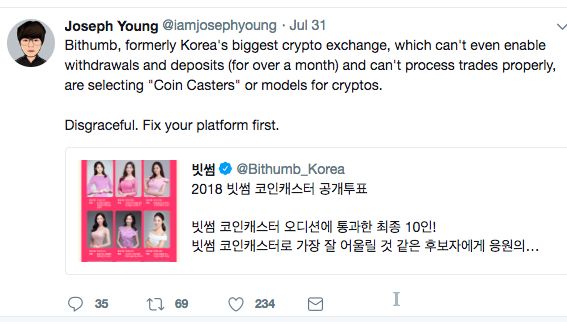 2018 年 7 月,福布斯分析师 Joseph Young 关注到 Bithumb 的事件后发推特 diss Bithumb 的做法:「作为曾经的韩国最大虚拟货币交易所,在长达 1 个多月不能充提币也不能进行交易的情况下,然而却热衷于区块链小姐姐选秀的活动。太恶心了,请先修复好交易平台。」