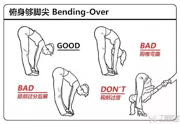 这幅漫画里将俯身够脚尖分为了正确和错误的姿势,但实际上我们并不推荐用这个姿势来拉伸。