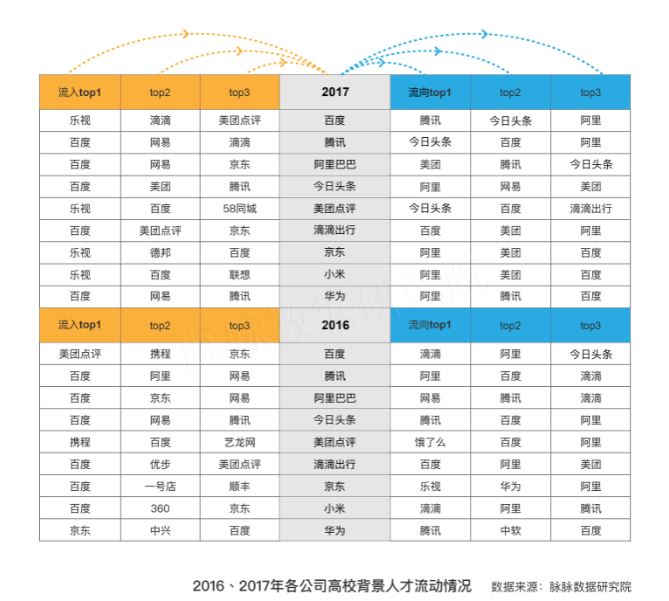 从2016年和2017年里10所高校人才在明星互联网公司的迁徙图表来看,互联网雇主开始新一轮排名。最明显的是,TMD势头明显,成为BAT各家员工跳槽的新选择。