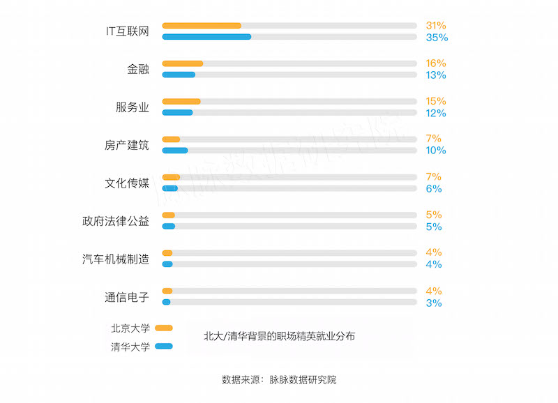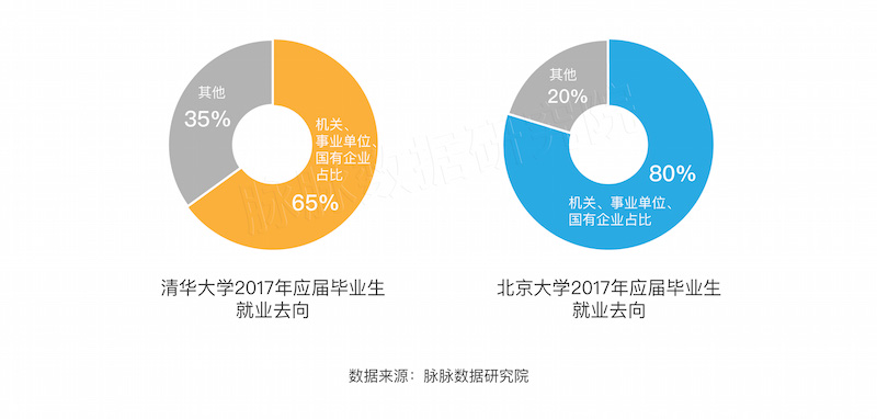 就拿2017年应届毕业生来说,65.3%的清华人和80%的北大人选择了机关、事业单位和国有企业。