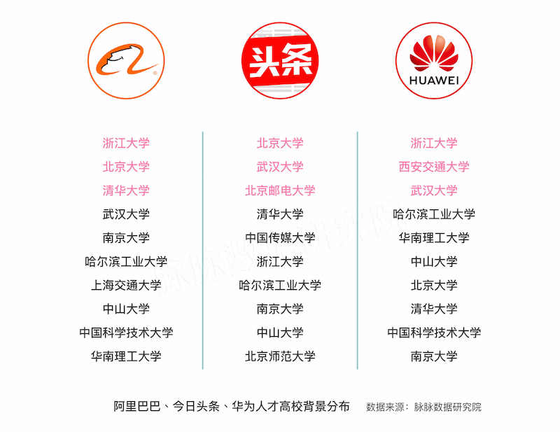 今日头条行事风格更加独特,他们偏爱北大、武大和北京邮电大学的学生。