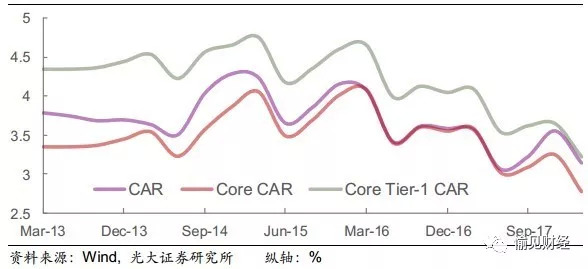 光大证券7月底的一份研究报告里计算出了下图数据:各种资本充足指标减去监管下线。读图便知,当前商业银行的资本充足率与监管最低值之间的“安全垫”正在缩小且已处于较低的水平。