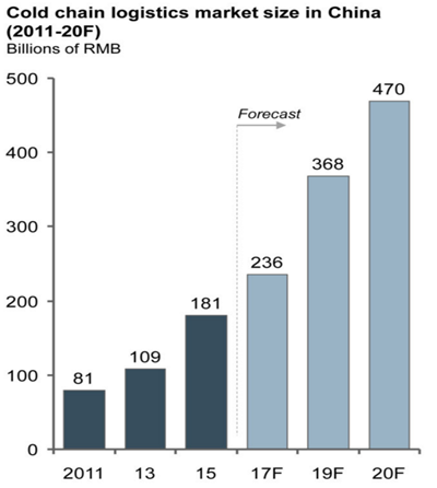 我国的冷链物流市场前景广阔,据中国物流与采购网,目前我国的冷链市场规模在2500亿元左右,预计到2020年,市场规模可以达到4700亿元,年复合增速将超过20%。