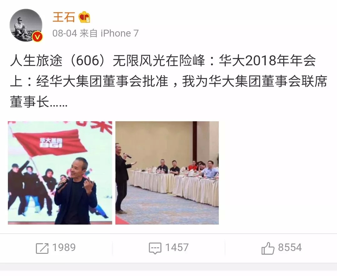 8月4日深夜11点多,王石通过个人微信和微博正式宣布:“人生旅途(606)无限风光在险峰:华大2018年年会上:经华大集团董事会批准,我为华大集团董事会联席董事长......”