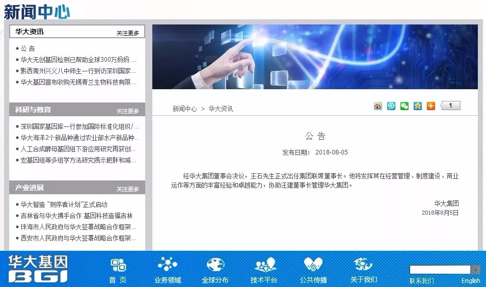 8月5日上午,华大集团也通过官网公告,对王石履新情况进行了公告,确认王石正式出任华大集团联席董事长。