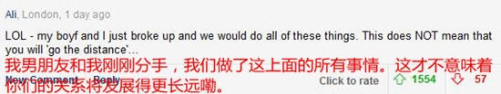 负责这项研究的发言人称:“看到人们要花将近1年的时间才能相处得舒服,这是一件很有趣的事。在恋爱的初期,大家都会表现出最好的自己,在一些事情上小心翼翼。随着时间的推移,情侣之间建立了信任,自己在恋人面前也有了自信。有些人肯定会说你们提出的那30个标志成功终结了浪漫,但这些其实是情侣关系中非常好的信号,它们意味着你们彼此相处没有负担,可以分享任何话题,而不用担心对方的反应。”