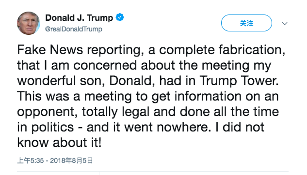 特朗普在推文中说:“完全捏造的假新闻报道说,我在担心我的好儿子小特朗普在特朗普大厦的会面。这次会面是为了取得一些竞争对手的信息,是完全合法且在政治中经常发生的——而且也没什么结果。我完全不知情!”