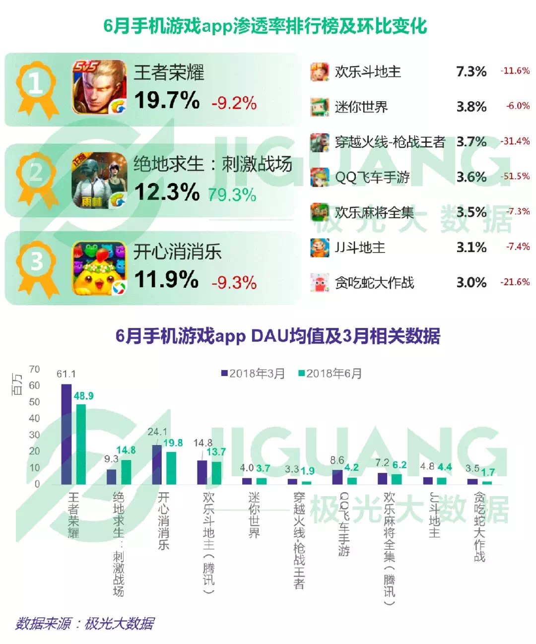 在此背景下,腾讯依然在渗透率TOP10中占据6席成为赢家,其中绝地求生:刺激战场渗透率上升至12.3%,季度环比增长79.3%,跃居第二。此前位列第一的王者荣耀6月渗透率季度环比下降9.2%,跌破20%。